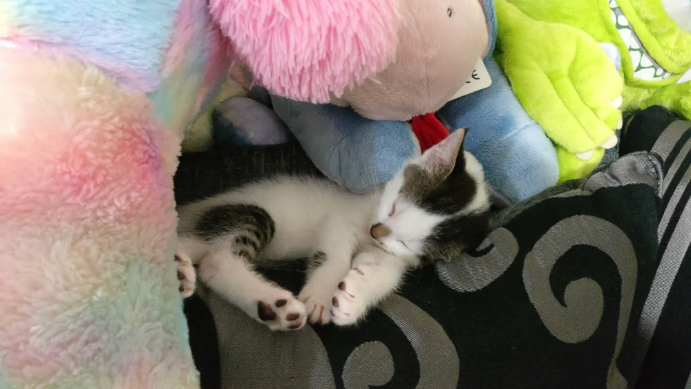 Arrangements were made and when he was old enough I was to come back and pick him up and take him home. About 6 weeks later, this tiny ball of fluff came home and made himself comfortable on the back of the sofa, hiding underneath a giant alicorn plushie.